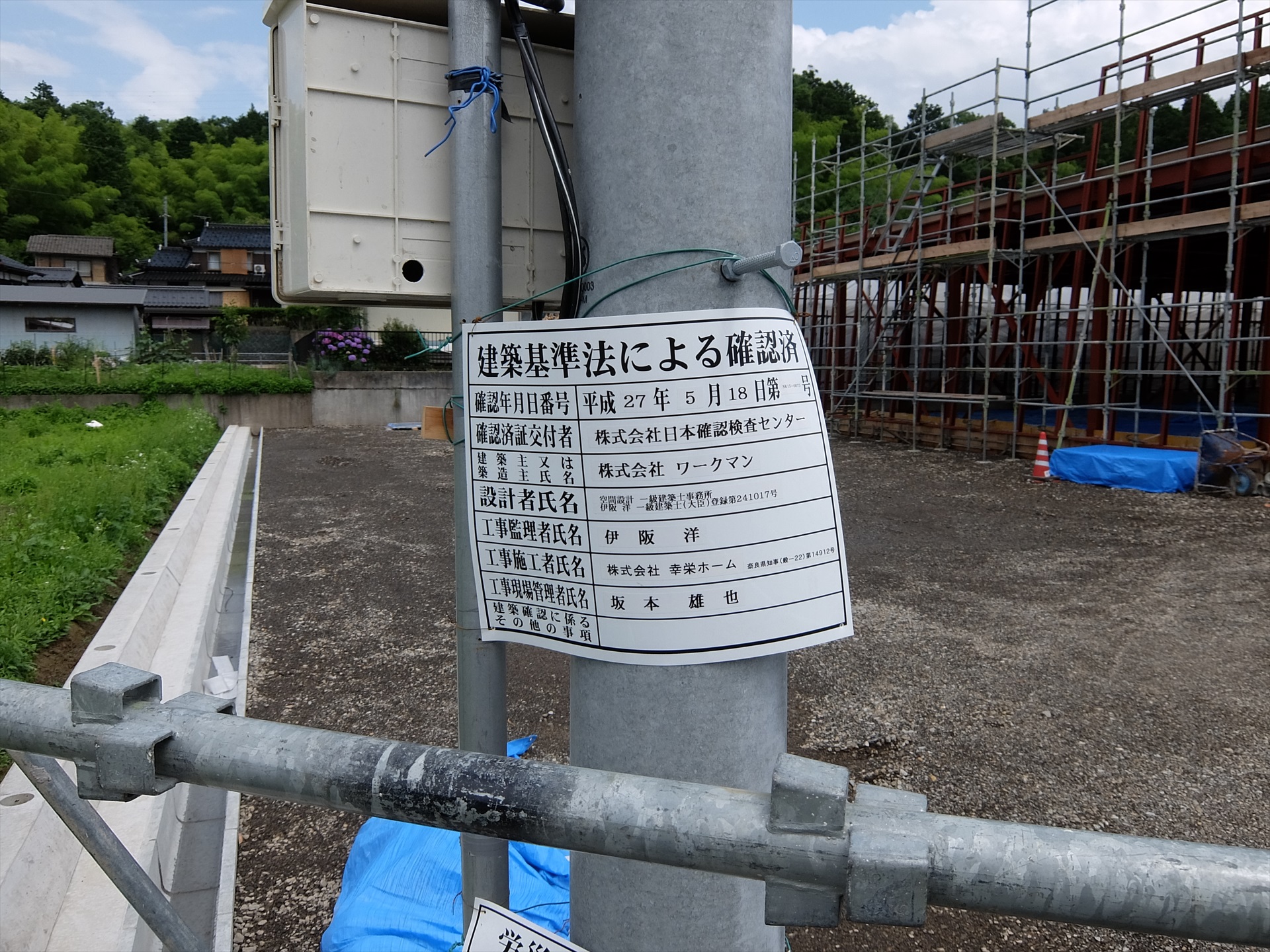建築基準法による確認済の掲示。施工は株式会社幸栄ホーム。