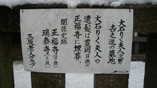 大石吉之進(おおいしきちのしん)とは誰なのか、知名度の高い大石内蔵助の墓ではないかというツッコミが想像されますが、大石吉之進は大石内蔵助と妻りくの次男で、直接的な関係はあります。